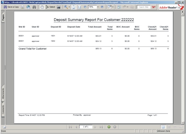 A date range and format must first be specified. This report presents a view of all the deposits processed for a particular CUSTOMER showing totals and distributions to BOC and Check21.