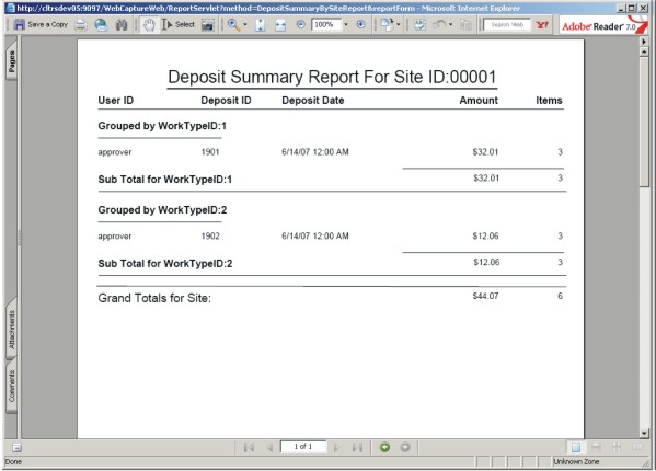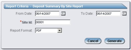 A date range, format and Site ID must first be specified. This report presents a view of all the deposits processed for a particular SITE showing totals per work type.